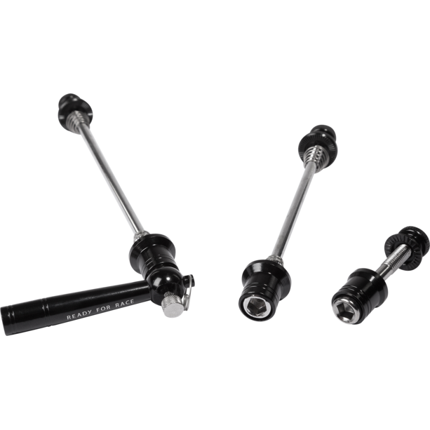 Einbaumaße Hinterrad 135/145 mm, Vorderrad 100/110 mm, Sattelklemmenbolzen max. 28 mm, CrMo-Achse, Diebstahlschutz, sehr leicht, einfache Montage.