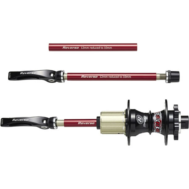 Adapter und Reduzierhülse für alle Naben mit Ø12 mm Bohrung, um diese für Ø10 mm Steckachsen oder Schnellspann Achsen zu verwenden (Reverse Components patent pending)!
